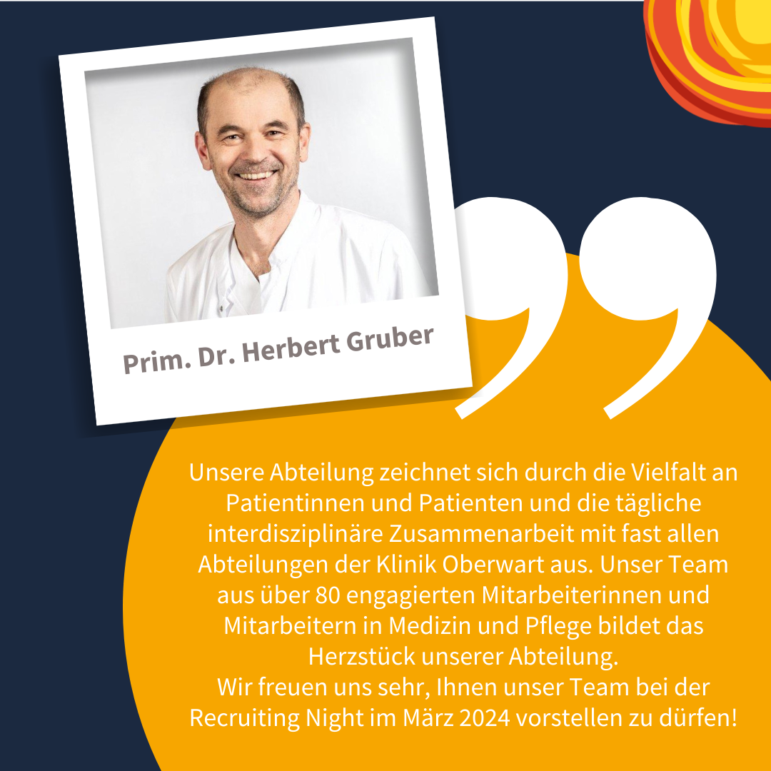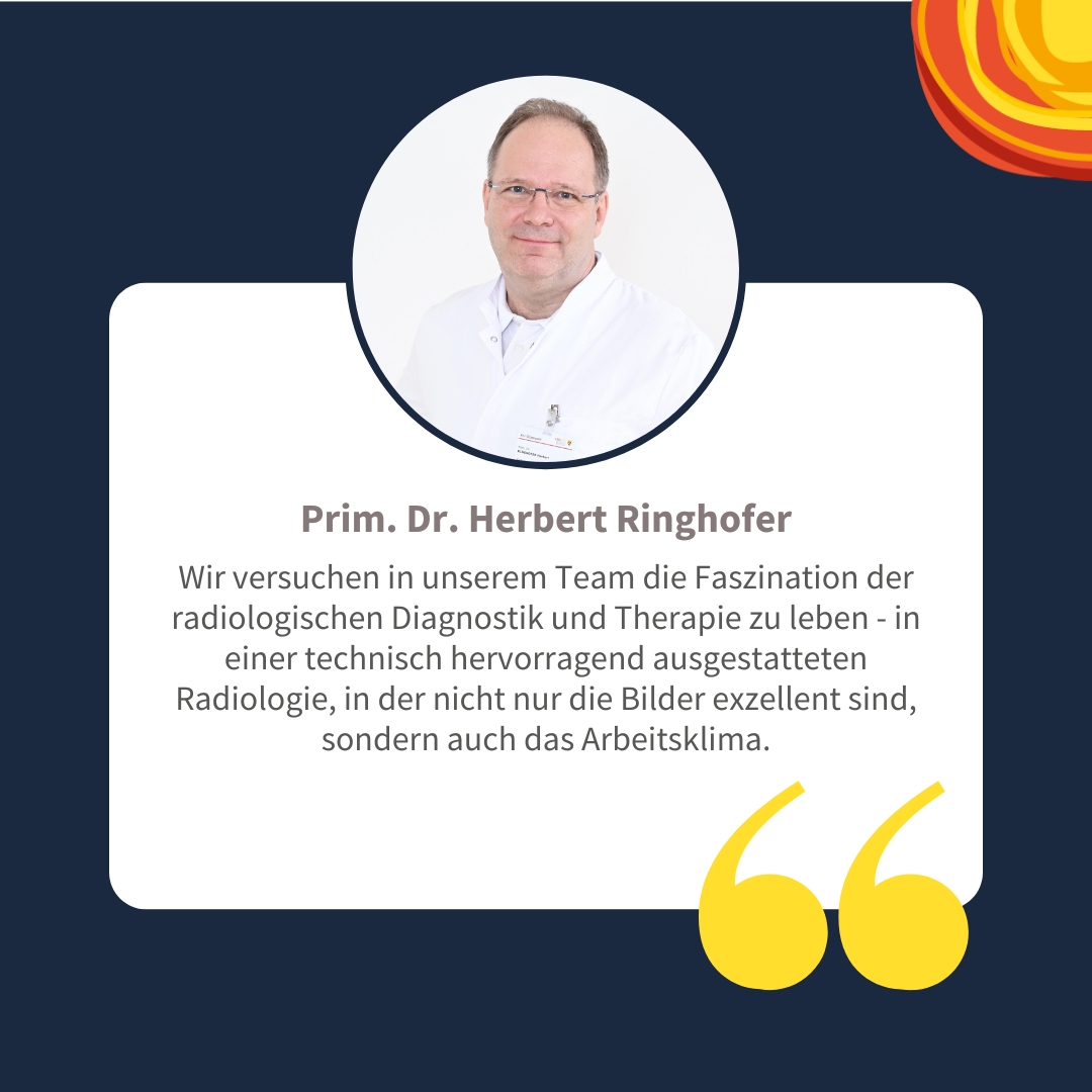 “Wir versuchen in unserem Team die Faszination der radiologischen Diagnostik und Therapie zu leben - in einer technisch hervorragend ausgestatteten Radiologie, in der nicht nur die Bilder exzellent sind, sondern auch das Arbeitsklima.”, ist Abteilungsleiter Prim. Dr. Herbert Ringhofer von seiner Abteilung überzeugt.