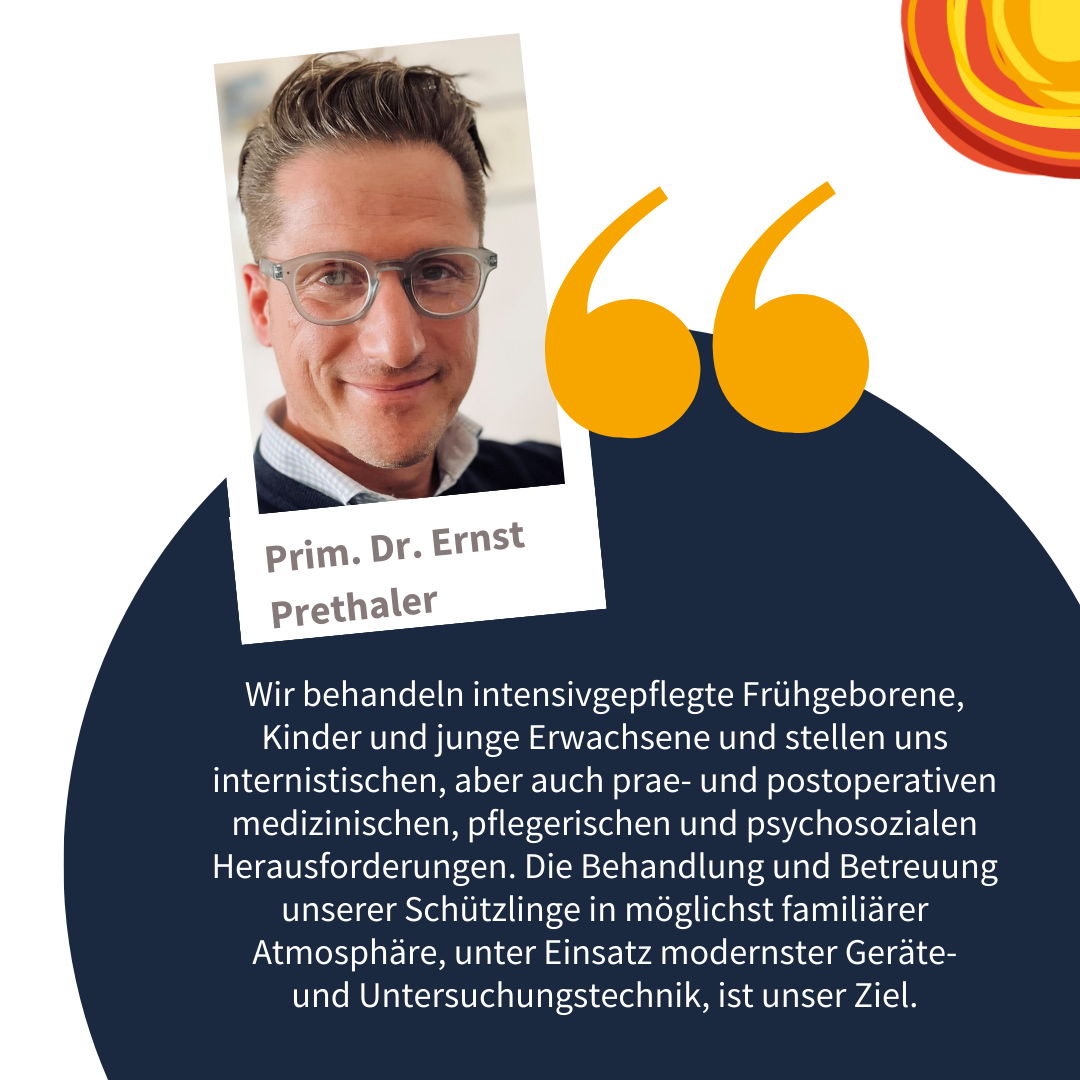 In der Abteilung für Kinder- und Jugendheilkunde mit Neonatologie arbeiten 55 Personen aus verschiedenen Professionen. Die Abteilung deckt in Diagnostik und Therapie fast alle Bereiche der Kinder- und Jugendheilkunde ab und ist daher aufgrund der enormen Bandbreite des Patientengutes interessant. „Wir behandeln vom intensivgepflegten Frühgeborenen bis zum jungen Erwachsenen, mit internistischen, aber auch prae- und postoperativen medizinischen, pflegerischen und psycho-sozialen Herausforderungen“, gibt Prim. Dr. Ernst Prethaler Einblicke in seine vielfältige Abteilung.