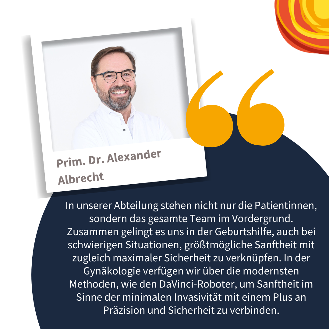 Das Team der Gynäkologie und Geburtenhilfe Oberwart rund um Prim. Dr. Alexander Albrecht zeichnet sich durch die professionelle Zusammenarbeit mit allen Abteilungen der Klinik und seine familiäre Basis aus. Das Ermöglichen einer sanften Geburt und die Erfüllung individueller Patientinnenwünsche stehen im Mittelpunkt. In der Gynäkologie kommen modernste Operationstechniken (Schlüssellochchirurgie) zum Einsatz und ermöglichen somit minimalinvasive Eingriffe.
