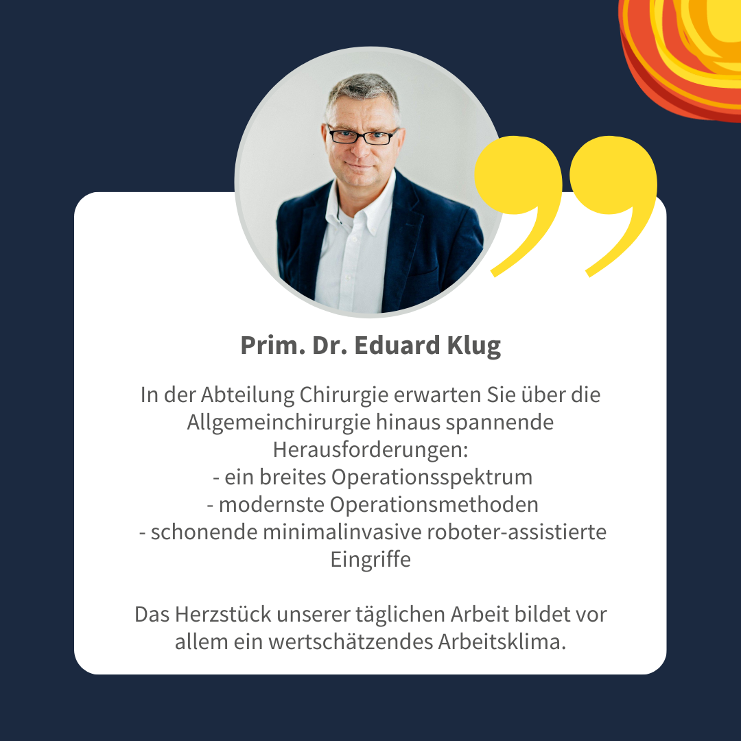Die Abteilung Chirurgie umfasst ein über die Allgemeinchirurgie hinaus großes Operationsspektrum mit modernsten Operationsmethoden: schonende minimalinvasive roboter-assistierte Eingriffe, Hernienchirurgie, Chirurgie des Magens und des gesamten Darmtraktes, Bauchspeicheldrüsen- und Leberchirurgie, Gefäßchirurgie und Thoraxchirurgie.