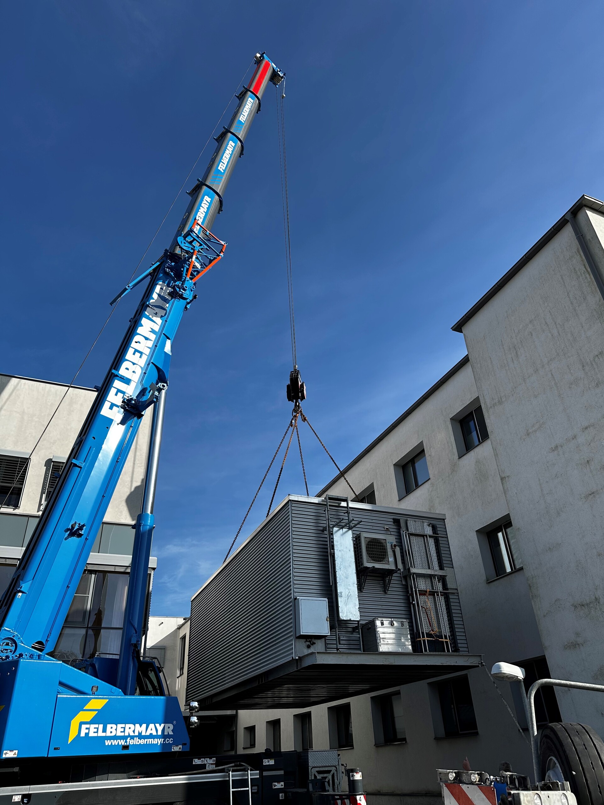 Die Anlieferung des mobilen CT der Firma Siemens in die Klinik Oberpullendorf erfolgte am 28. Oktober 2024 planmäßig durch einen Sondertransport. Ein Kranwagen hob das Gerät auf seinen Platz. Nun kann in Kürze damit begonnen werden, den bestehenden Computertomografen abzubauen. Nach erfolgreicher Einschulung des Personals, soll der mobile CT in der Woche nach Martini seinen Betrieb aufnehmen. Für die Patientinnen und Patienten ändert sich (fast) nichts: Sie nehmen vor der Untersuchung, wie gewohnt, im Ambulanzbereich der Radiologie im Erdgeschoß der Klinik Platz. Nach dem Aufrufen fährt man, begleitet von medizinischem Personal, mit dem Lift einen Stock hinunter, um zum mobilen CT zu gelangen, der in einem Container vor der Klinik untergebracht ist.