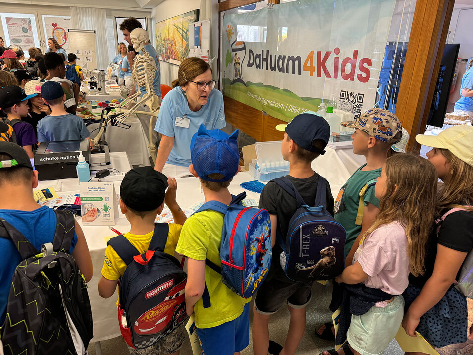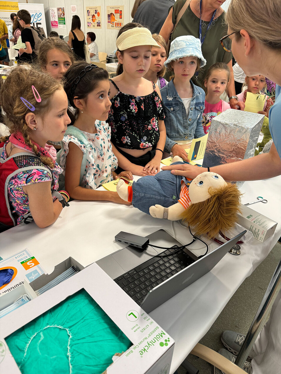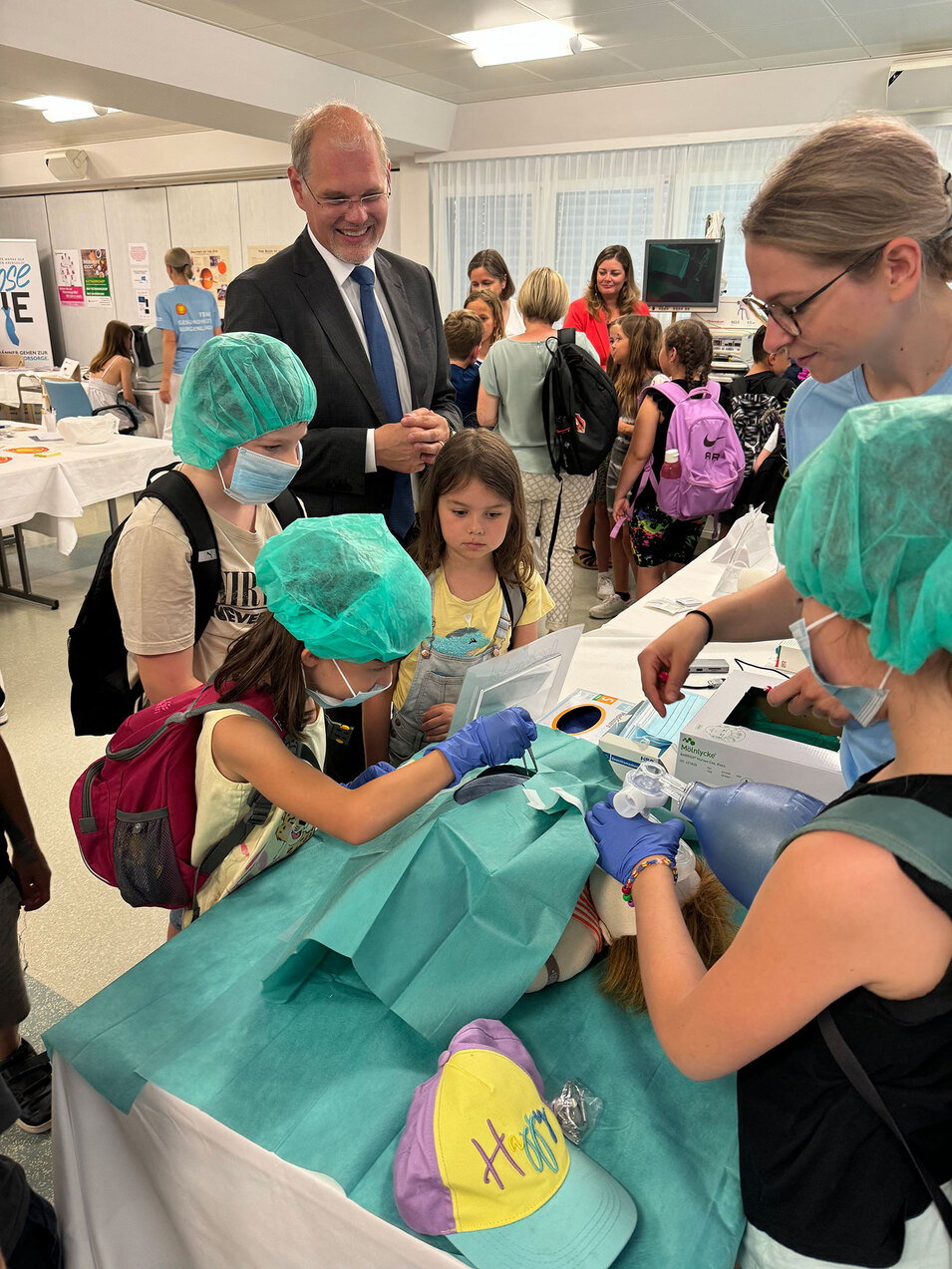 Im Gebäude der Klinik ging es spannend weiter: Besucherinnen und Besucher durften selbst Hand anlegen, etwa bei endoskopischen Untersuchungen an Übungspuppen oder beim OP-Training, im Rahmen dessen laparoskopische Eingriffe simuliert wurden. Neben Ständen zu Krebshilfe, Stoma-Ambulanz, Endometriose und Blutzuckermessungen mithilfe von Schnelltests gab es auch eine lustige Schnitzeljagd in drei Schwierigkeitskategorien sowie eine Skelett-Selfie-Station.